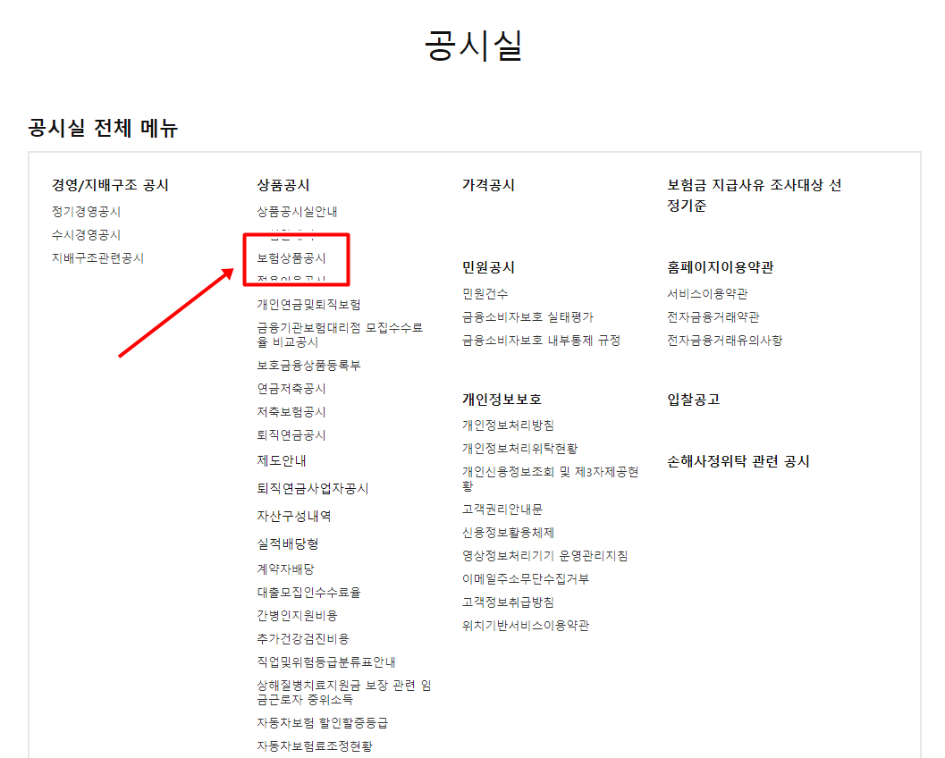 그다음 아래 메뉴중에서 상품공시 메뉴중 그 아래 "보험상품공시" 가 있을겁니다. 보험상품공시를 클릭해 주세요.