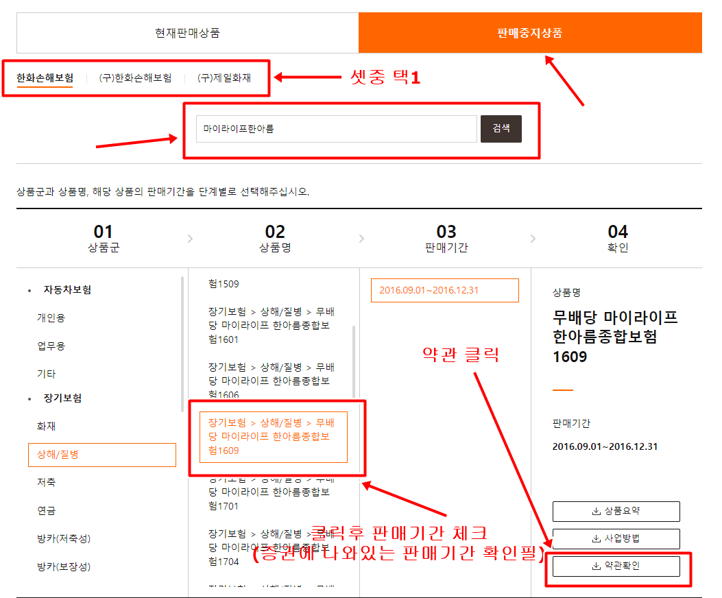 따라서 지금부터 제가 예를 들면서 설명 드립니다. 저는 한화손해보험의 "마이라이프 한아름 종합보험1609" 라는 상품을 찾아 보겠습니다. 이 보험은 한화손해보험에서 출시된 상품으로 당연히 지금은 판매중단상태 입니다.