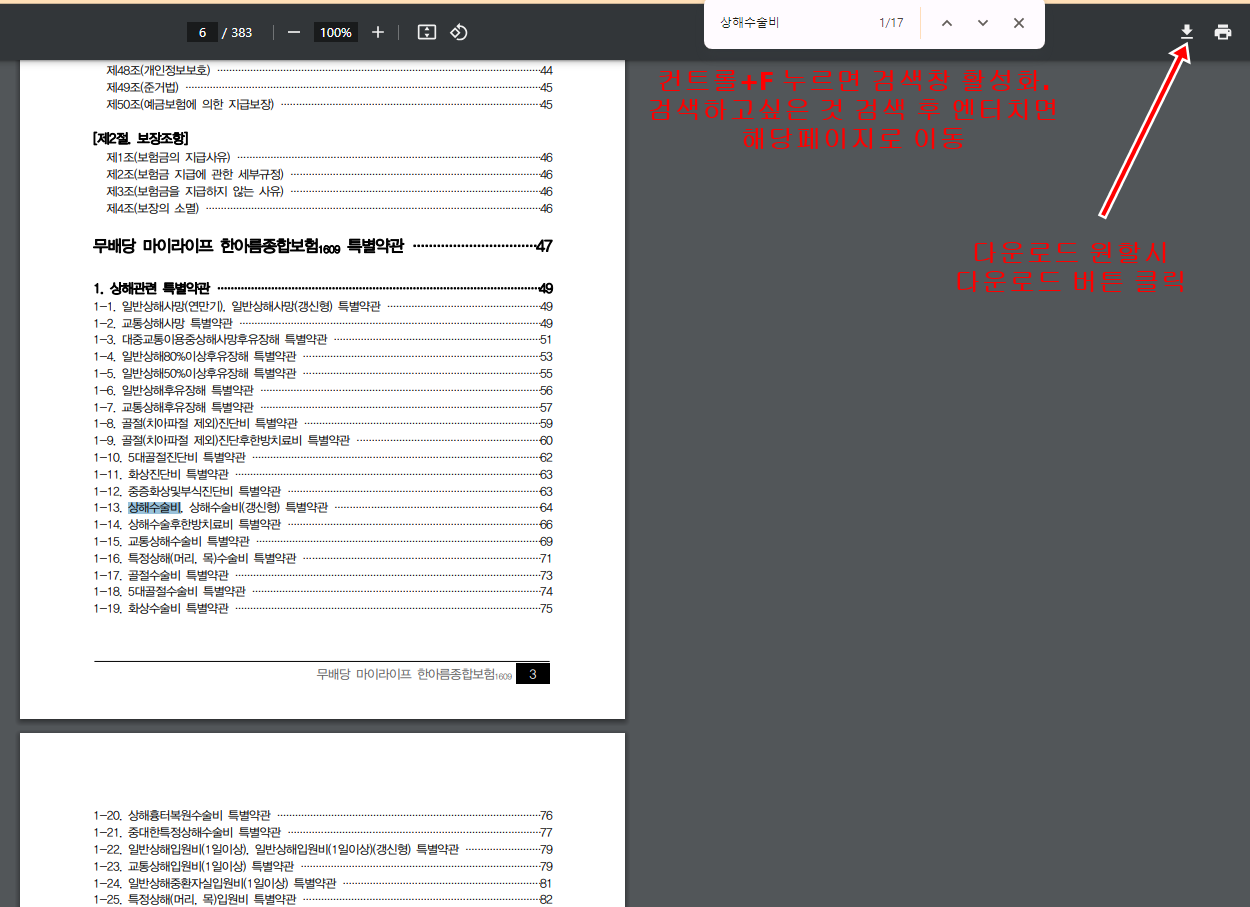 예를 들어 골절에 대해 궁금하다면 약관을 켜시고 컨트롤+F 키를 동시에 누른 후 검색창에 상해수술비라고 치시면 상해수술비 관한 내용을 찾아 볼 수 있습니다.