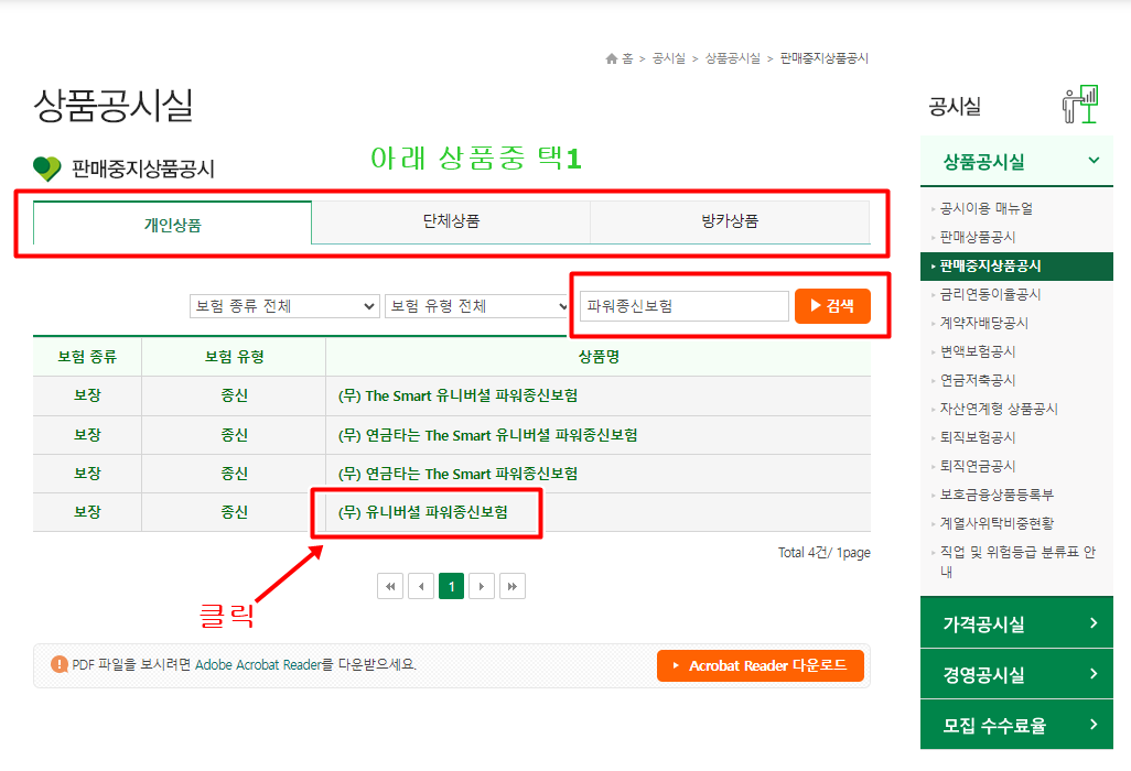 그다음 우측 상품공시실에서 판매상품공시 또는 판매중지상품공시가 보이실 겁니다. 여기서는 판매중지상품을 선택 하세요. 이유는 계속해서 설명 드립니다.