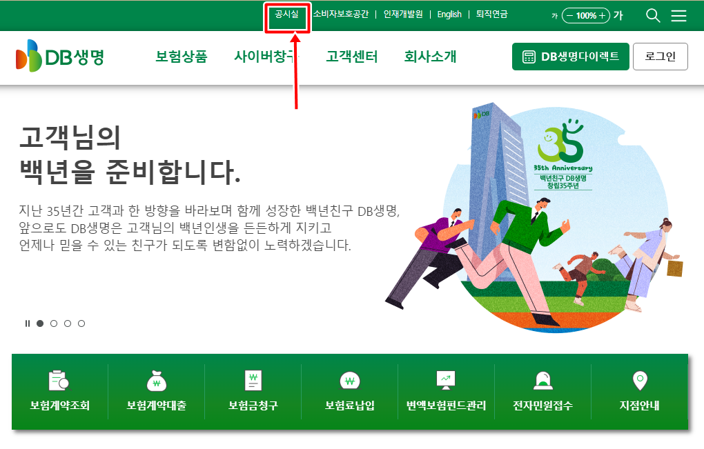 DB생명(동부) 약관 다운로드 하는 방법에 대해 알려 드립니다. 먼저 DB생명 홈페이지로 이동 해 주세요. DB생명 홈페이지 메인화면에 보면 상단에 공시실 이라는게 보이실 겁니다. 공시실을 클릭 해 주세요.
