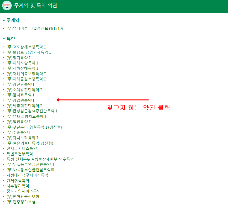 약관을 클릭하시면 다음과 같은 화면이 뜹니다. 찾고자 하시는 항목을 선택하면 어디로 저장할지 선택하게 됩니다. 저는 암진단특약I를 다운받아 보겠습니다.