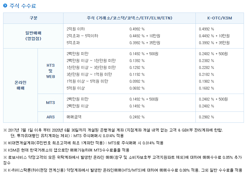 교보증권의 국내주식 매매수수료는 HTS 거래시 2백만원 이하는 0.1492%에 + 500원, 200만원 이상시 0.1392%등 입니다. 5억원 이상 매매 해야 주식거래 수수료가 0.0692% 입니다. 단 비대면 계좌개설을 한 경우 MTS로 주식 거래시 0.014%가 적용 됩니다.
