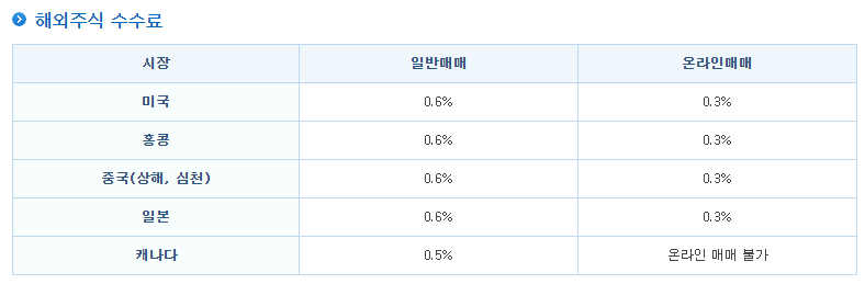 교보증권의 해외주식 거래 수수료는 아래 표와 같습니다. 온라인 매매시 캐나다를 제외한 4개 국가는 0.3% 입니다.