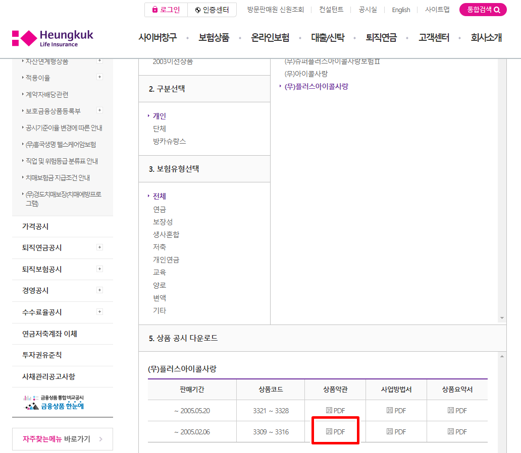 따라서 지금부터 제가 예를 들면서 설명 드립니다. 저는 흥국생명의 "플러스아이콜사랑" 이란 상품을 찾아 보겠습니다. 이 보험은 2005년에 출시된 상품으로 당연히 지금은 판매중단상태 입니다.