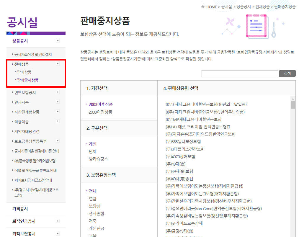 근데 대부분의 사람들이 찾고자 하는 보험은 판매중지상품 카테고리에 있을것 입니다. 왜냐하면 보험상품은 길어야 1년이내에 단종이 되기 때문 입니다.