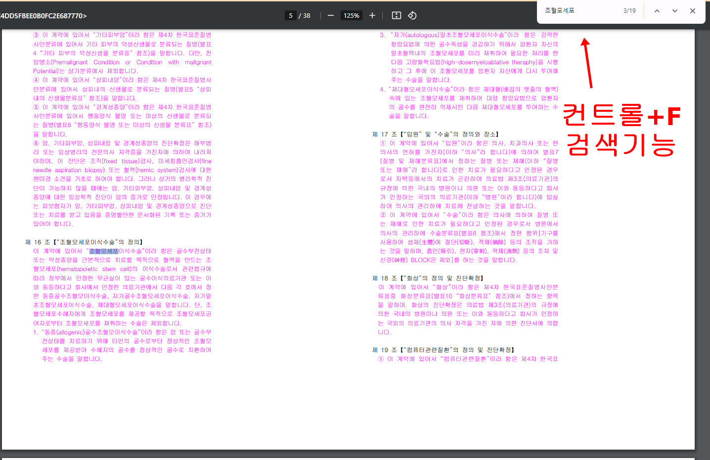 예를 들어 조혈모세포에 대해 궁금하다면 약관을 켜시고 컨트롤+F 키를 동시에 누른 후 검색창에 조혈모세포라고 치시면 조혈모세포에 관한 내용을 찾아 볼 수 있습니다.