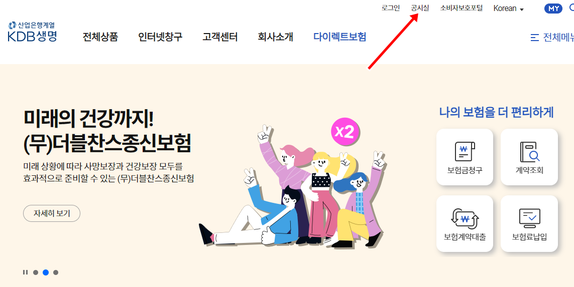 KDB생명 약관 다운로드 하는 방법에 대해 알려 드립니다. 먼저 KDB생명 홈페이지로 이동 해 주세요. KDB생명 메인화면에 보면 상단에 공시실 이라는게 보이실 겁니다. 공시실을 클릭 해 주세요.