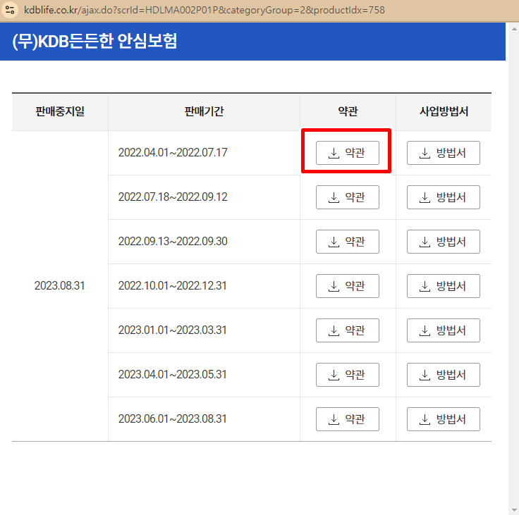 따라서 저는 판매중지상품의 "KDB든든한 안심보험" 이란 상품을 찾아 보겠습니다. 이 보험은 22년 4월에 출시된 상품으로 당연히 지금은 판매중단상태 입니다.