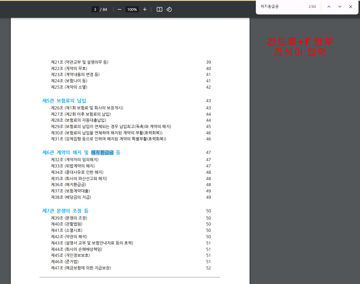예를 들어 해지환급금에 대해 궁금하다면 약관을 켜시고 컨트롤+F 키를 동시에 누른 후 검색창에 해지환급금이라고 치시면 해지환급금에 관한 내용을 찾아 볼 수 있습니다.