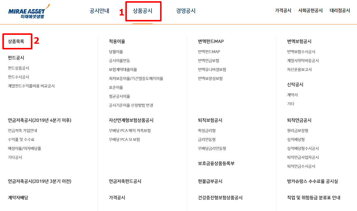 그다음 상단에 상품공시에 마우스를 올려 두시면 아래 메뉴들이 쭉 뜨는데요. 여기서 가장 좌측상단의 상품 목록을 클릭해 주세요.