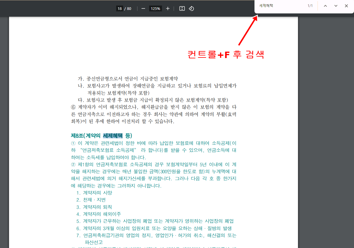 예를 들어 세제혜택에 대해 궁금하다면 약관을 켜시고 컨트롤+F 키를 동시에 누른 후 검색창에 세제혜택 이라고 치시면 세제혜택 관한 내용을 찾아 볼 수 있습니다.