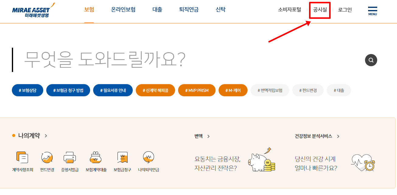 미래에셋생명 약관 다운로드 하는 방법에 대해 알려 드립니다. 먼저 미래에셋생명 홈페이지로 이동 해 주세요. 미래에셋생명 메인화면에 보면 상단에 공시실 이라는게 보이실 겁니다. 공시실을 클릭 해 주세요.