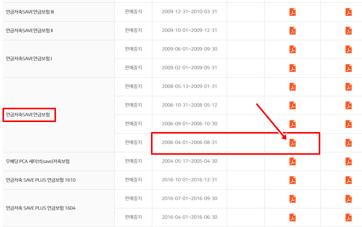 제가 찾고자 하는 SAVE연금보험은 06년 9월 3일에 가입한것이기 때문에 판매기간을 보고 상품을 선택해야 합니다. 내 보험의 가입일자를 보시려면 반드시 증권을 먼저 확인해야 합니다. 때문에 본문 최상단에 미래에셋생명 증권 조회 방법글을 링크로 남겨 드린것 입니다.