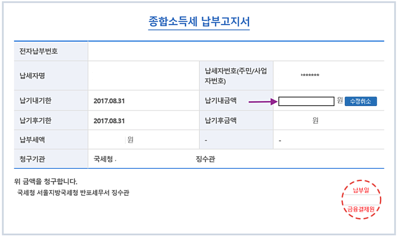 납기내금액에 표시된 내가 내야할 세금의 총액이 표시되는데요. 우측의 금액 수정을 눌러 주세요.