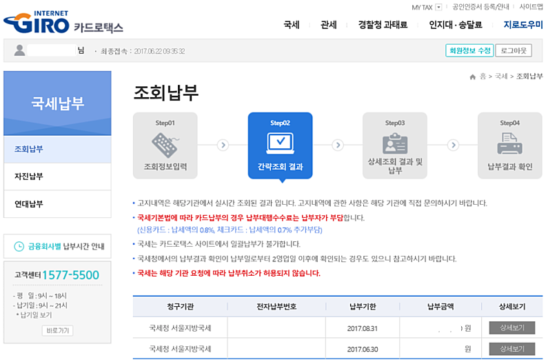 한도회복후 2차 결제도 조회납부를 하는 경우에는 불가 할 수 있습니다. 따라서 1개 카드로 선결제후 한도회복-> 2차 결제시도를 할 경우에는 반드시 "자진납부" 를 선택하셔서 세금 납부를 진행 하십시오.
