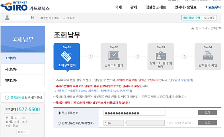 한도회복후 2차 결제도 조회납부를 하는 경우에는 불가 할 수 있습니다. 따라서 1개 카드로 선결제후 한도회복-> 2차 결제시도를 할 경우에는 반드시 "자진납부" 를 선택하셔서 세금 납부를 진행 하십시오.