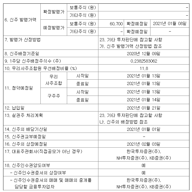 포스코케미칼의 유상증자 예정발행가는 60,700원 입니다. 그러나 어디까지나 예정일뿐 입니다. 확정예정일은 21년 1월 8일에 결정되기 때문에 확정가로 계산해야 합니다.