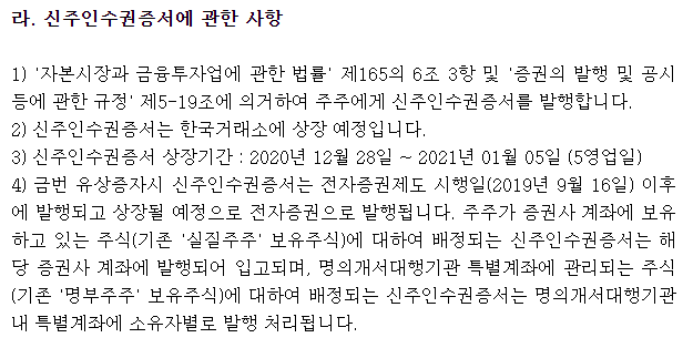 청약예정일은 21년 1월 13일부터 14일 이틀간이며, 14일은 오후2시에 청약접수가 마감이 되기 때문에 서두르셔야 합니다. 참고로 예약청약이란 서비스를 각 증권사에서 하고 있으니 본인 증권사에 문의하시어 청약의지를 반드시 표하셔야 합니다. 제가 다른 회사들의 유상증자 사례를 글 하단에 링크첨부할테니 한번씩 읽어보시면 도움이 되실 겁니다.