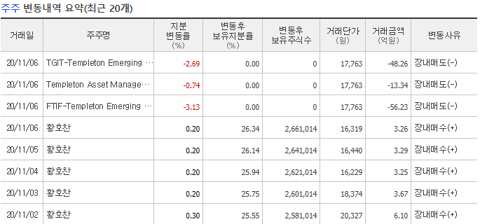 11월 6일의 장대음봉이 나온날은 TGIT-Templeton Emerging(이하 템플턴자산운용)에서 물량이 쏟아져 나와 장대음봉이 나와준것인데, 아직 지난 금요일 한스바이오메드 하한가날에 매매 세부내역은 아직 보고가 안됐기 때문에 좀더 지켜봐야 하겠습니다. 챠트는 상장폐지 챠트만큼이나 최악이지만 대표이사 황호찬씨가 계속 매입을 한 부분 때문에 참 아리송 합니다.