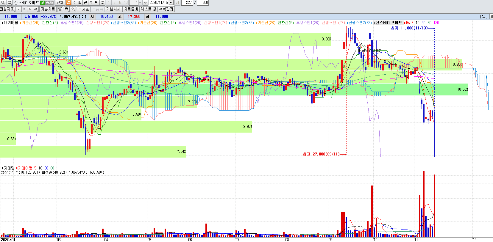 한스바이오메드는 여타 다를바 없는 올해 3월부터의 모든 개별주의 공통된 챠트모양을 가지고 있습니다만 9월말 약 330만주의 장대음봉이 나와줍니다. 유통주식이 720만주 인데 이중 절반가량의 대량거래가 발생되며 장대음봉이 나와준것 인데요. 이후 11월초 갭하락에 이은 흑삼병(음봉3회 연속) 발생 후 대량거래 음봉이 나와버렸습니다. 추세가 아예 무너지고 챠트가 망가진것 입니다.