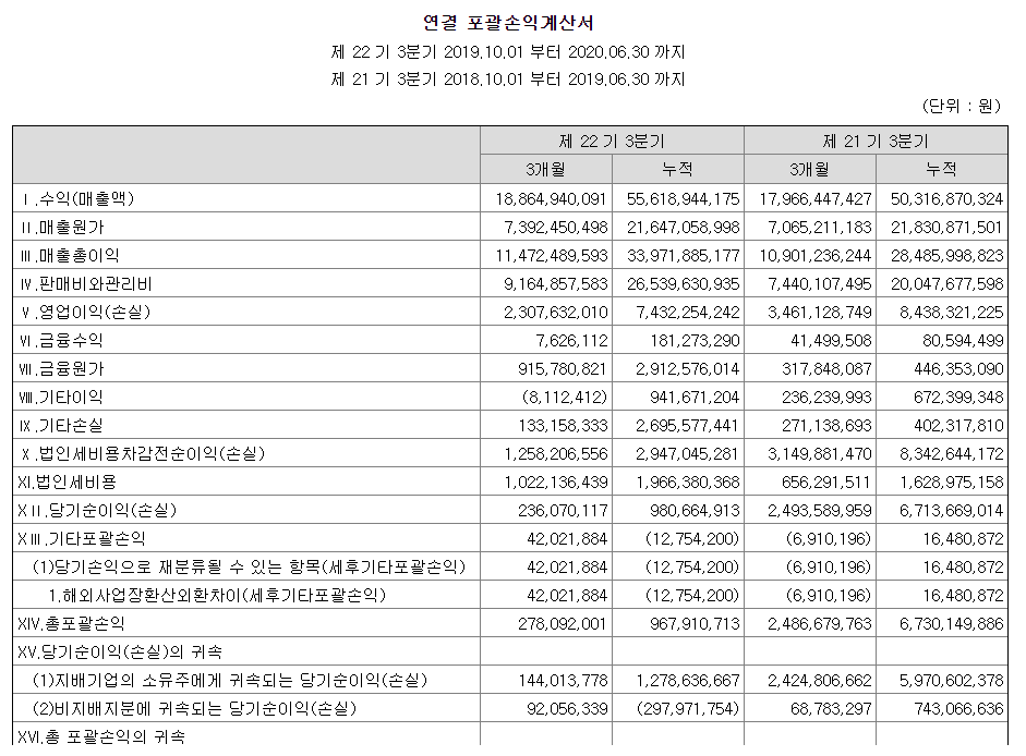 현금보유량이 적다면 유상증자같은 악재가 나올 수 있기 때문에 중요하게 생각하셔야 합니다. 그럼 뭐가 많은거고 뭐가 적은건지의 기준은 어떻게 정하느냐? 포괄손익계산서를 보시면 알 수 있습니다.