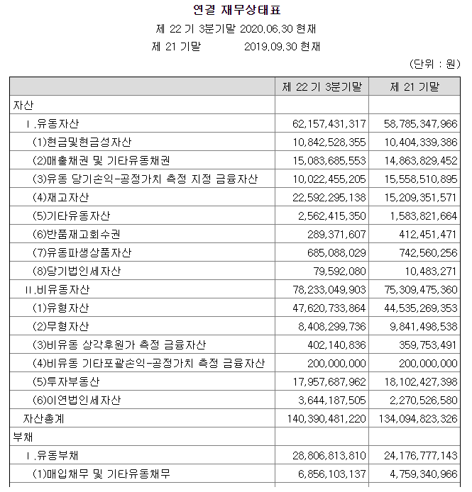 한스바이오메드의 연결재무 상태표 입니다. 재무상태표를 볼때 가장 중요한 부분이 있는데요.