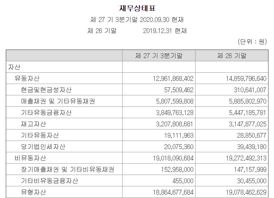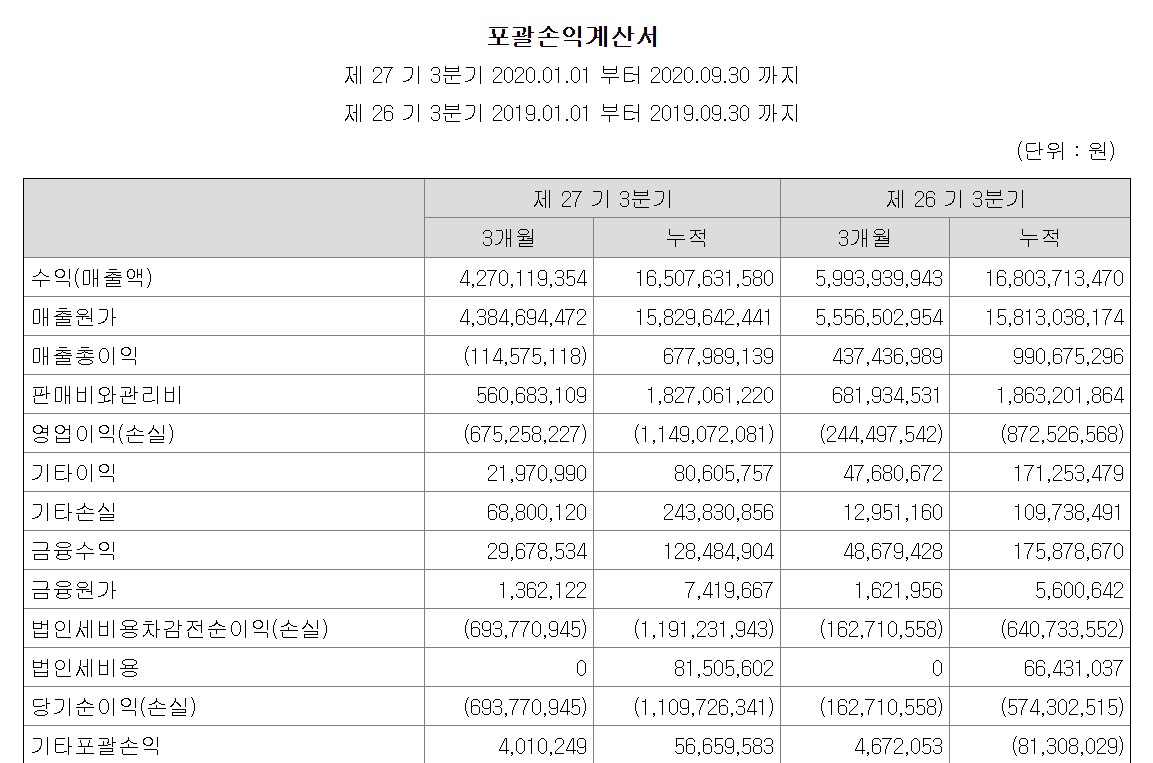 동방선기는 코스닥 상장사로써 코스닥 관리종목 상장폐지 규정을 적용받고 있으며, 지주회사는 아니고 지배회사도 아니라 별도재무제표를 가지고 규정을 논하면 되겠습니다. 상기 표는 올해 3월에 나온 동방선기 19년도 감사보고서 내용 입니다. 현재 동방선기는 3년연속 연속 적자를 기록중에 있기 때문에 올해 역시 적자가 지속이라면 21년 3월 관리종목 편입가능성이 있습니다. 그럼 올해 3분기까지 동방선기가 영업성과를 얼마나 냈는지 아래 표를 보면서 다시 설명 드리겠습니다.