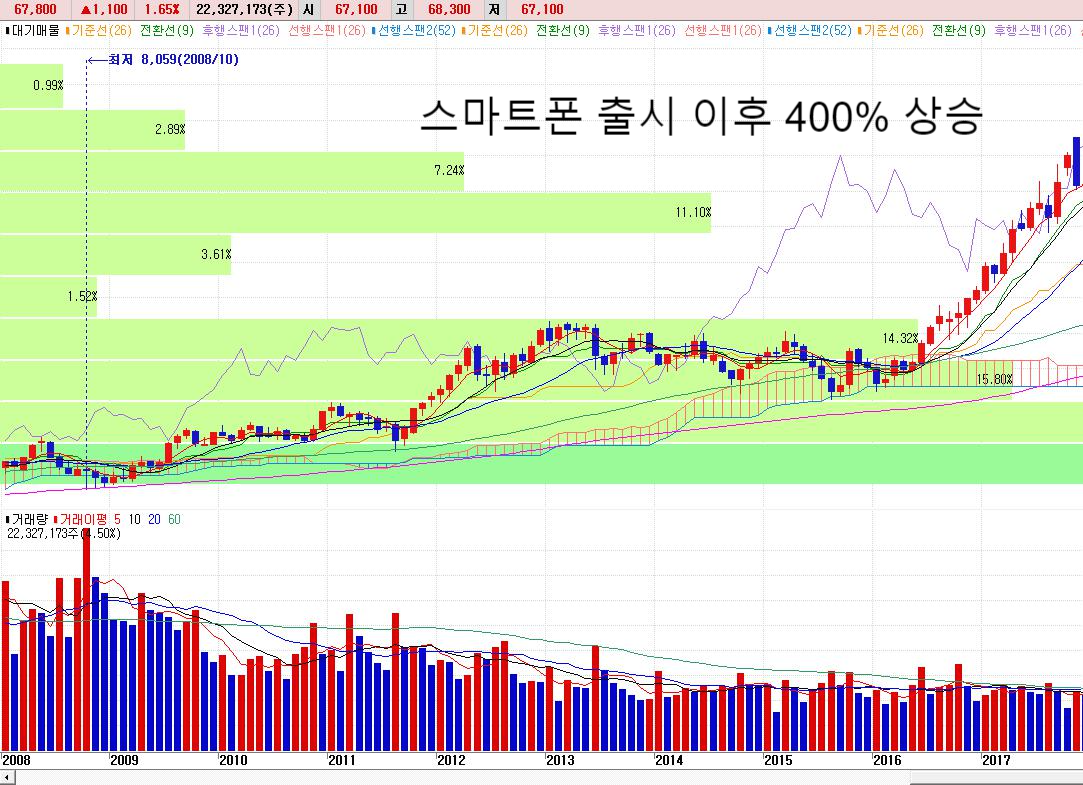 삼성이 옴니아2를 출시했을때도 말입니다. 삼성은 아이폰에 대항하기 위해 스마트폰을 출시했고 옴니아에 이어 갤럭시 시리즈가 연이어 출시가 됐습니다. 그리고 삼성전자의 주가는 출시 이후 2배상승 후 3~4년간 횡보 이후 다시 2배상승을 했죠. 출시일에서 보면 400%상승을 했습니다. 기간은 약 5~6년이 걸렸지요.