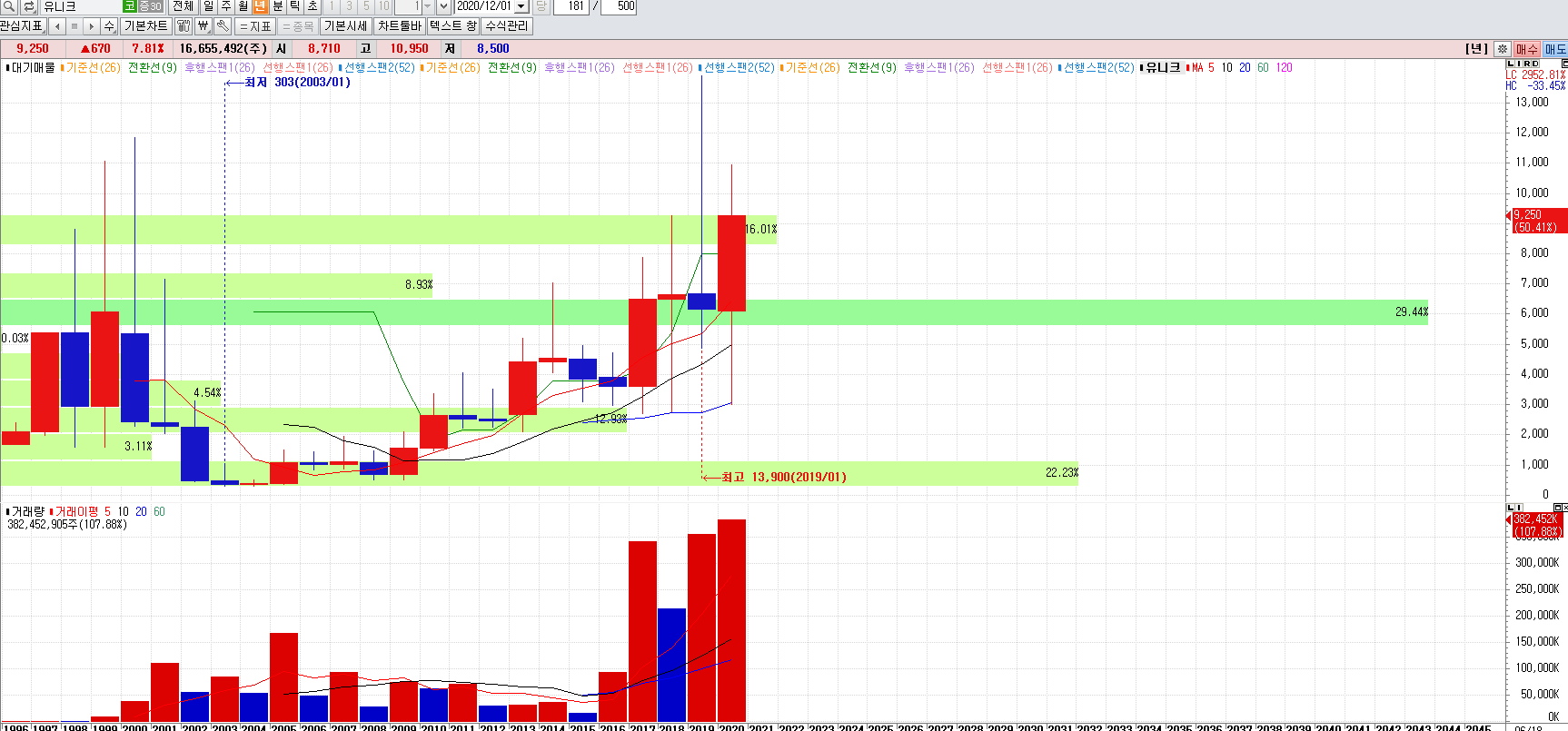 유니크는 1996년 상장 이후 시장 소외주였는데, 최근 3년간 엄청난 양의 거래량이 나오고 있습니다. 지난번 글에도 말씀드렸듯이 긴시간 소외주식에 갑작스런 수급이 발생되는 것은 누군가가 매집중인 것으로 보셔도 무방 합니다. 거래량은 거짓말을 하지 않습니다. 보통은 거래를 터뜨리며 매집을 하고 이후 거래량을 죽이면서 지친 개미들의 물량을 뺏어가고 주식이 모아지면 재료를 터뜨리며 출발합니다.