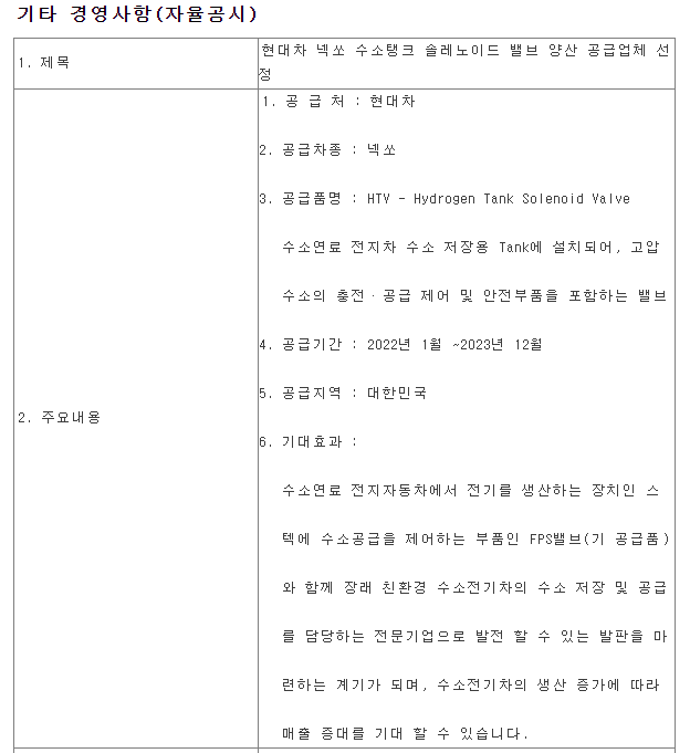 오늘 유니크의 현대차 넥쏘에 수소탱크 솔레노이드 밸브 양산 공급업체로 선정되었다는 자율공시 내용입니다. 공급기간은 22년 1월부터 23년 12월까지 2년간이라 당장은 유의미한 매출발생이 나오지는 않겠지만 향후 현대기아차 수소탱크 부품을 납품할 수 있음으로 기대감이 큰게 사실 입니다.