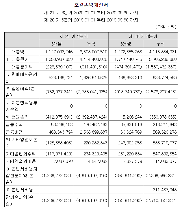 테라셈은 관리종목인데도 불구하고 올해 3분기까지 누적적자가 벌써 -27억원에 달합니다. 다른 큰 회사들에 비하면 작은 수치이지만 테라셈에게는 큰 숫자죠. 테라셈은 지주회사는 아니고 지배회사 이기 때문에 연결재무제표가 아닌, 일반 재무제표로 보겠습니다.(지주회사일 경우 연결재무제표를 적용함)