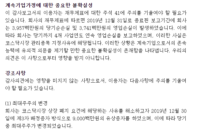 강조사항은 차치하고 중요하게 보셔야 할것이 바로 계속기업가정에 대한 중요한 불확실성 입니다. 이게 정말 엄청난 겁니다. 참고로 2년전에 딱 반기 적자만 냈을뿐인데 바로 상장폐지 당한 회사들이 꽤있습니다. 요즘은 회계법인들이 깐깐하게 봅니다. 과거와는 전혀 다릅니다. 재무제표의 숫자도 숫자지만 기업의 계속성이 불확실하다면 즉시 의견거절을 내버리죠.