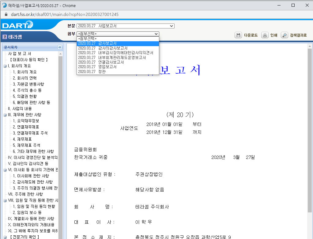 그리고 테라셈을 검색한 후 가장 최근 사업보고서를 열람해 줍니다. 20년도 3월에 있을겁니다. 사업보고서를 열어보시면 첨부에 감사보고서라고 있을겁니다. 감사보고서를 눌러줍니다.