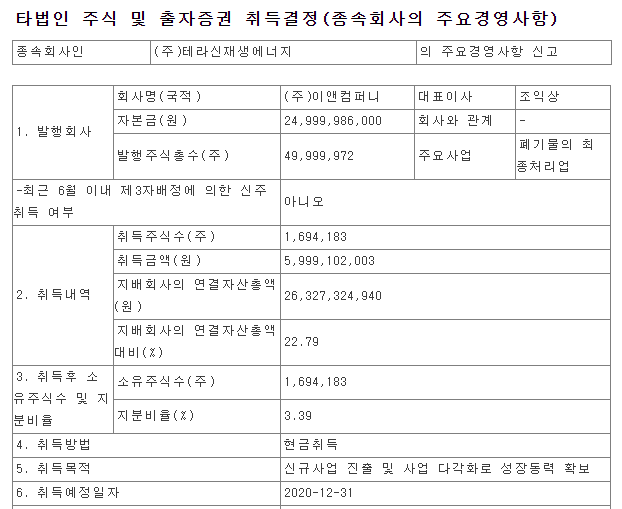 테라신재생에너지의 이앤컴퍼니 지분취득 공시