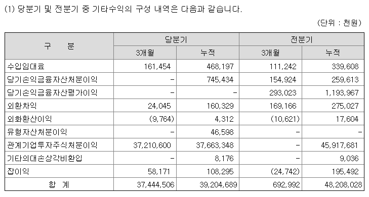 제넥신의 기타수익 부분은 관계기업의 투자주식을 처분한 이익으로 보입니다. 에스엘메타젠 주식만 매도한것으로 주석에는 보이지만 에스엘메타젠 매도액은 약 5억원가량이라 재무제표에 반영된 370억원은 좀더 연구를 해봐야할 것 같습니다.