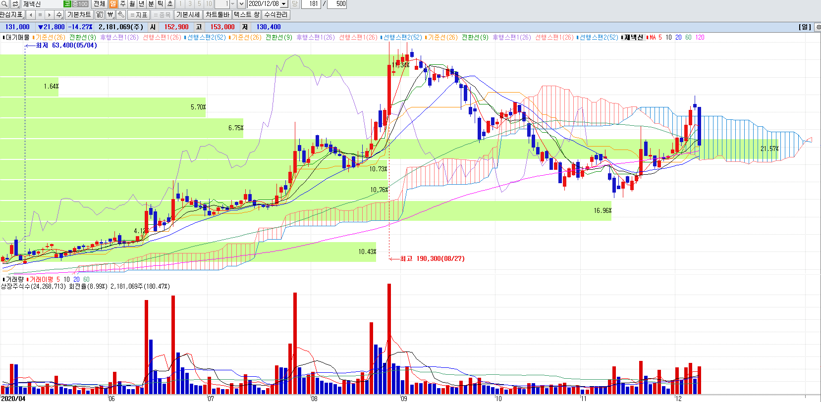제넥신은 20년 8월 19만원 신고가 달성 후 거래량 죽이며 조정중에 2파상승이 나오나 했더니 거래량이 크진 않지만 -14%대의 장대음봉이 나왔습니다. 갈자리에서 가지 못하면 주저앉게 되어 있는데 지금이 딱 그 형국입니다. 때문에 주가의 추가상승을 기대해보려면 정말 단기간에 반등이 나와줘야 합니다. 내일 120선(126,000원)에서 기술적 반등이 나와주지 않는다면 10만원 초반대까지 밀릴 가능성이 있어 보입니다.