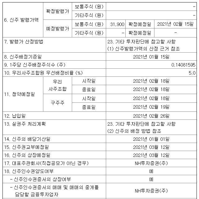 아직 확정발행가가 나오지 않아 예정발행가는 31,900원. 확정예정일21년 2월 15일 이며, 신주의 배정 기준일은 21년 1월 15일 입니다. 따라서 기준일을 포함하여 3일전인 21년 1월 13일 종가까지 매수가 되셔야 이번 멕아이씨에스 유상증자 신주인수권을 받을 자격이 주어 지는 것이며 14일 아침에 권리락이 나올것 입니다.