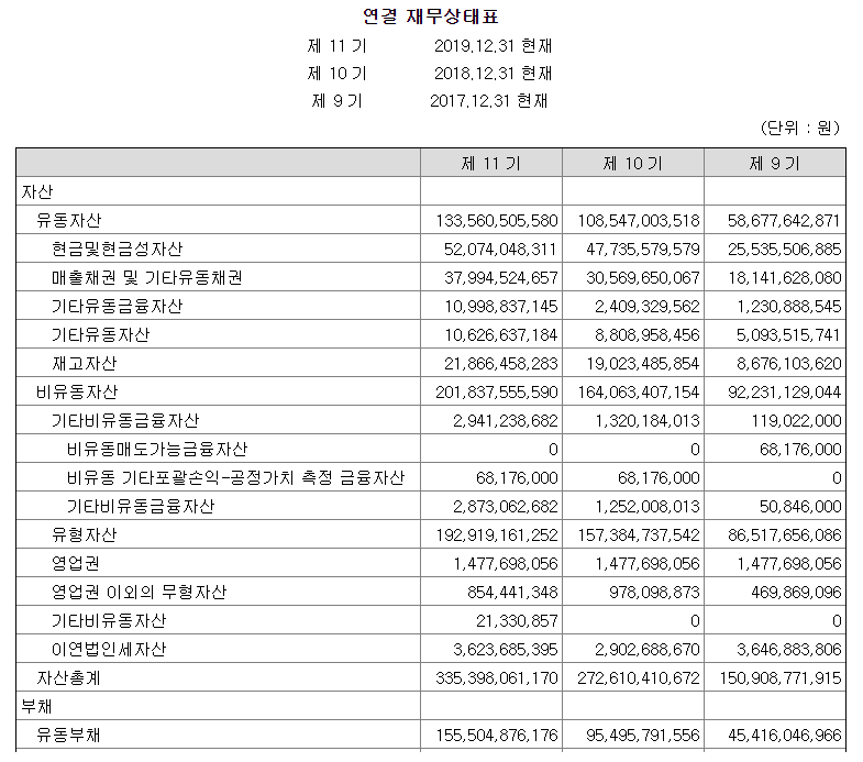 신흥에스이씨의 19년도 사업보고서상 포괄손익계산서 입니다. 마찬가지로 11기가 19년도. 우측으로 갈수록 전년도 입니다. 17년도에 비해 매출액이 90%가량 상승했으며 영업이익또한 두배로 늘었습니다. 전기차와 전기차 부품에 수요가 크게 증가함에 따라 회사는 생산시설 증대를 했고 그대로 반영되고 있는 모습 입니다. 재무적인 부분은 크게 걸리는것이 없습니다.