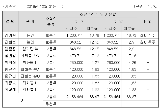김점용 회장과 아들 김기린 대표의 지분은 29.83%, 최화봉 회장과 그의 손자, 딸까지 최+황 일가의 지분이 29.83%로 동일 합니다. 그러나 회사가 커진다면 잡음이 나올 수밖에 없고 지분싸움으로 번져 주가가 급등할 소지가 분명히 있다고 판단이 됩니다.