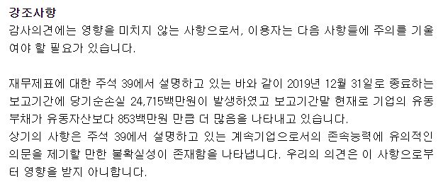 현재 쎌마테라퓨틱스는 자본잠식중에 있습니다. 올해 3분기가 되면서 더욱 그 추세가 빨리 지속되고 있지요. 또한 올해 3월 감사보고서에서 회계감사인이 지적한 강조사항을 아래에서 보시죠.