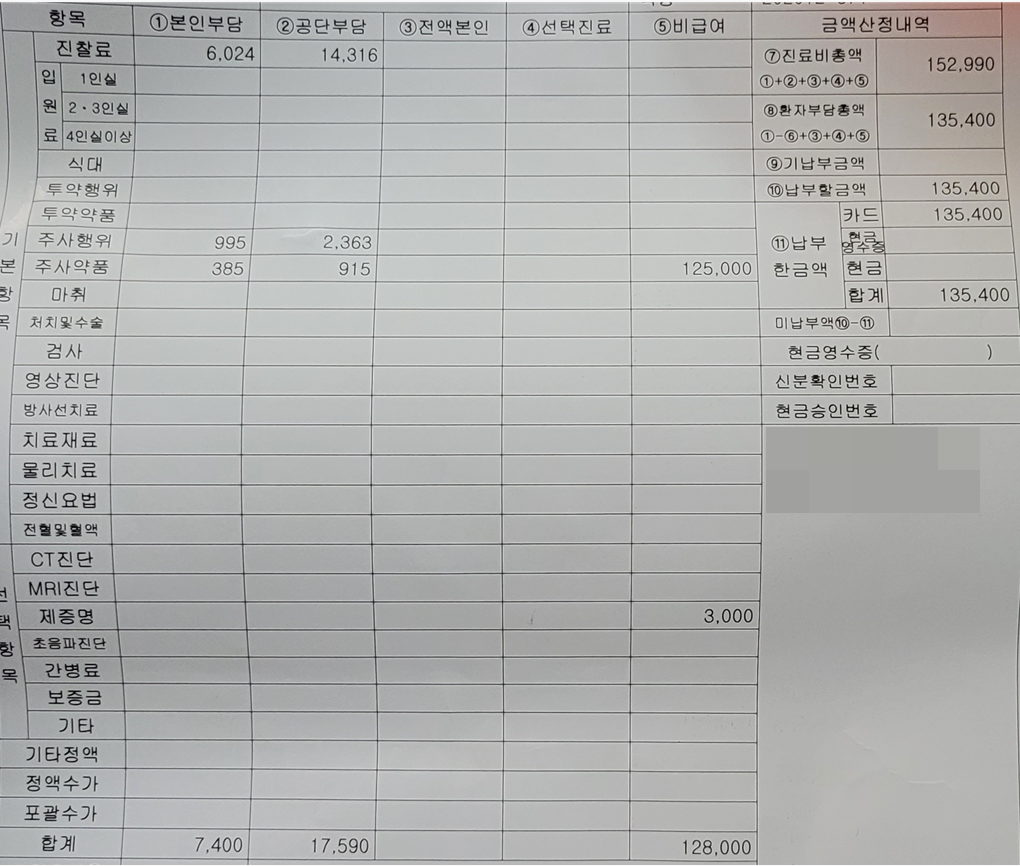 진료비 영수증의 모습입니다. 맨 좌측이 본인 부담금, 그다음이 공단부담금이며 가장 우측이 비급여 항목입니다. 공단부담금은 말그대로 국가에서 내주는 병원비이므로 내가 낸 병원비가 아니기 때문에 제외입니다. 그럼 7400원(급여) + 128,000원(비급여)를 하면 납부금액인 135,400원이 되게 됩니다. 그러나 제증명은 제외 입니다. 제증명이란 진료비영수증, 의사소견서등의 서류금액 입니다. 이 금액은 병원마다 상이하니 참고하시기 바랍니다.