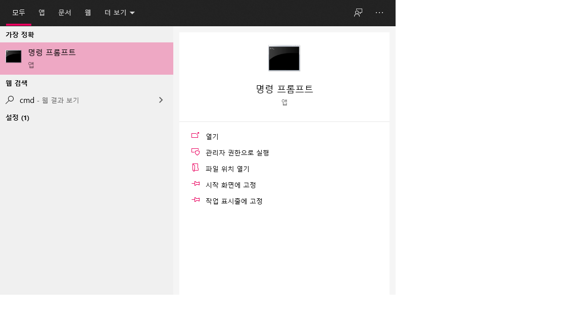 1. 화면 좌측하단에 검색창에 cmd 라고 치고 엔터를 누릅니다. 그럼 아래와 같은 화면이 뜰겁니다.