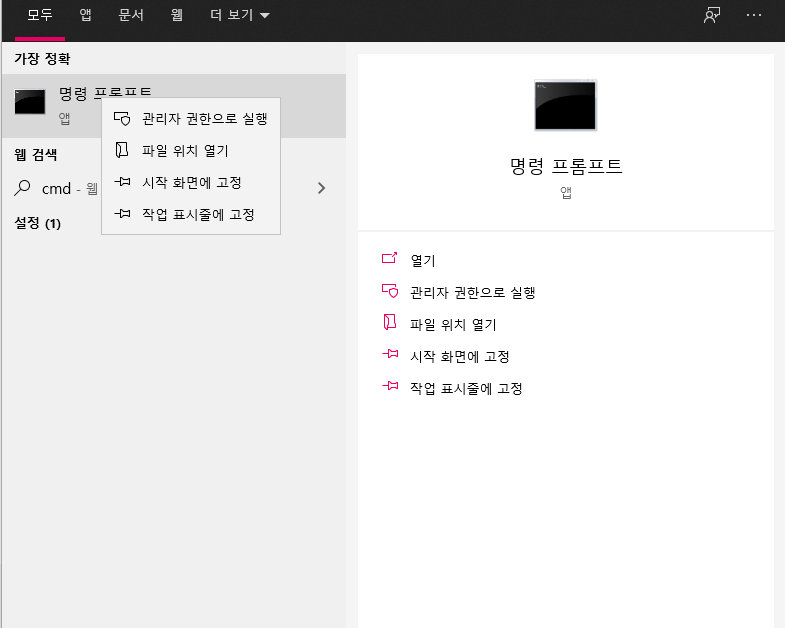 2. 그럼 명령프롬프트라는 메뉴가 나옵니다. 이 메뉴에 마우스를 가져다 대고 우측버튼을 누르면 아래와 같이 네가지 메뉴가 뜨는데 여기서 첫번째인 '관리자 권한으로 실행' 을 눌러줍니다.