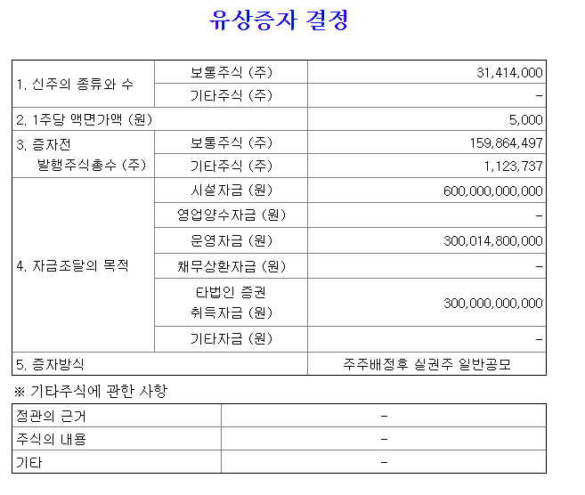 이번 한화솔루션의 유상증자로 인해 발행되는 신주의 수는 31,414,000주 입니다. 증자전 발행 주식수가 1억6천만주가량 되니 상장이 된다면 약 1억 9천만주 정도로 늘어나게 되어 주식 가치가 떨어질 수 밖에 없습니다만 태양광과 수소등 미래 먹거리 산업에 집중투자하겠다고 밝힌 만큼 큰 하락은 없을것이라는게 제 생각 입니다.