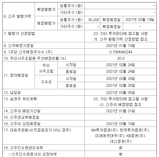 이번 한화솔루션 신주 예정발행가는 우선 38,200원입니다. 이것은 아직까진 예정발행가일 뿐이며, 확정발행가의 확정일은 21년 2월 19일 입니다. 이때의 신주발행가액 산정방법을 근거로 재 계산이 됩니다.