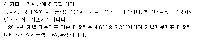 상기2항의 영업정지 금액은 19년도 "개별"재무제표 기준이며, 최근 매출 총액은 19년도 "연결"재무제표 기준 입니다 라고 명시하고 있습니다. 불리한것은 개별로 표시하고 득이 될것은 연결로 표시를 해놓은겁니다.