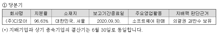 그러나 포비스티앤씨 3분기 보고서에 따르면 포비스티앤씨가 종속회사인 디모아의 지분을 다음과 같이 가지고 있다고 나오고 있습니다.