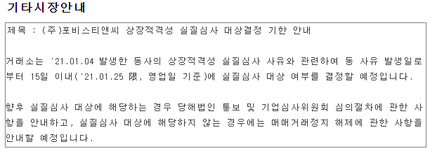 포비스티앤씨의 경우는 아직 상장폐지 실질심사 대상이 된게 아니라, 상장폐지 실질심사 대상에 올려둘지 말지를 현재 판단하는 중에 있는것 입니다. 기한은 21.01.25 이내 입니다.
