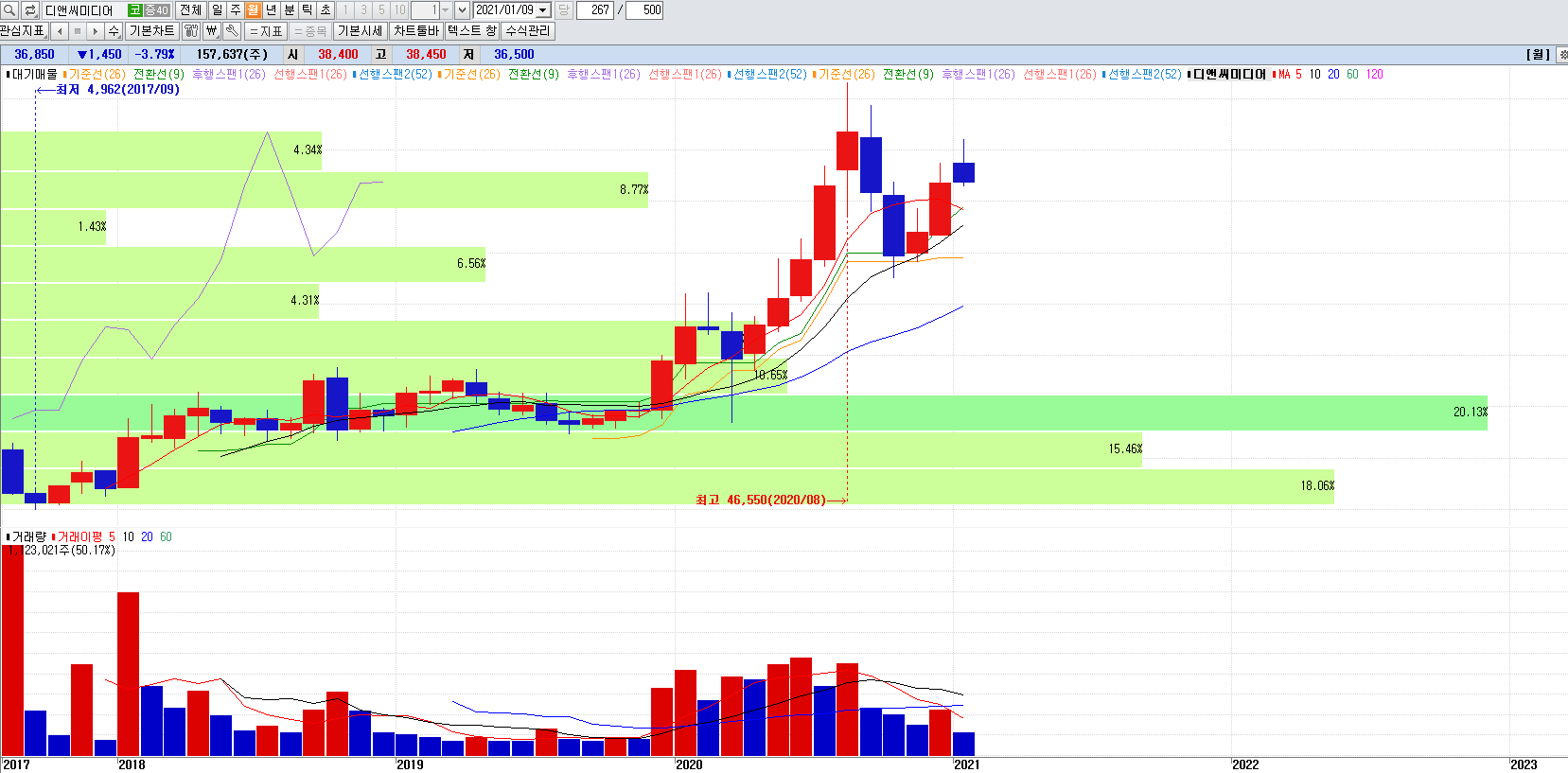 웹툰관련주 디앤씨미디어 월봉챠트